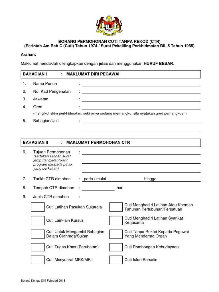Borang Permohonan Cuti Tanpa Rekod Borang Kemas Kini Feb 2018 Pdf